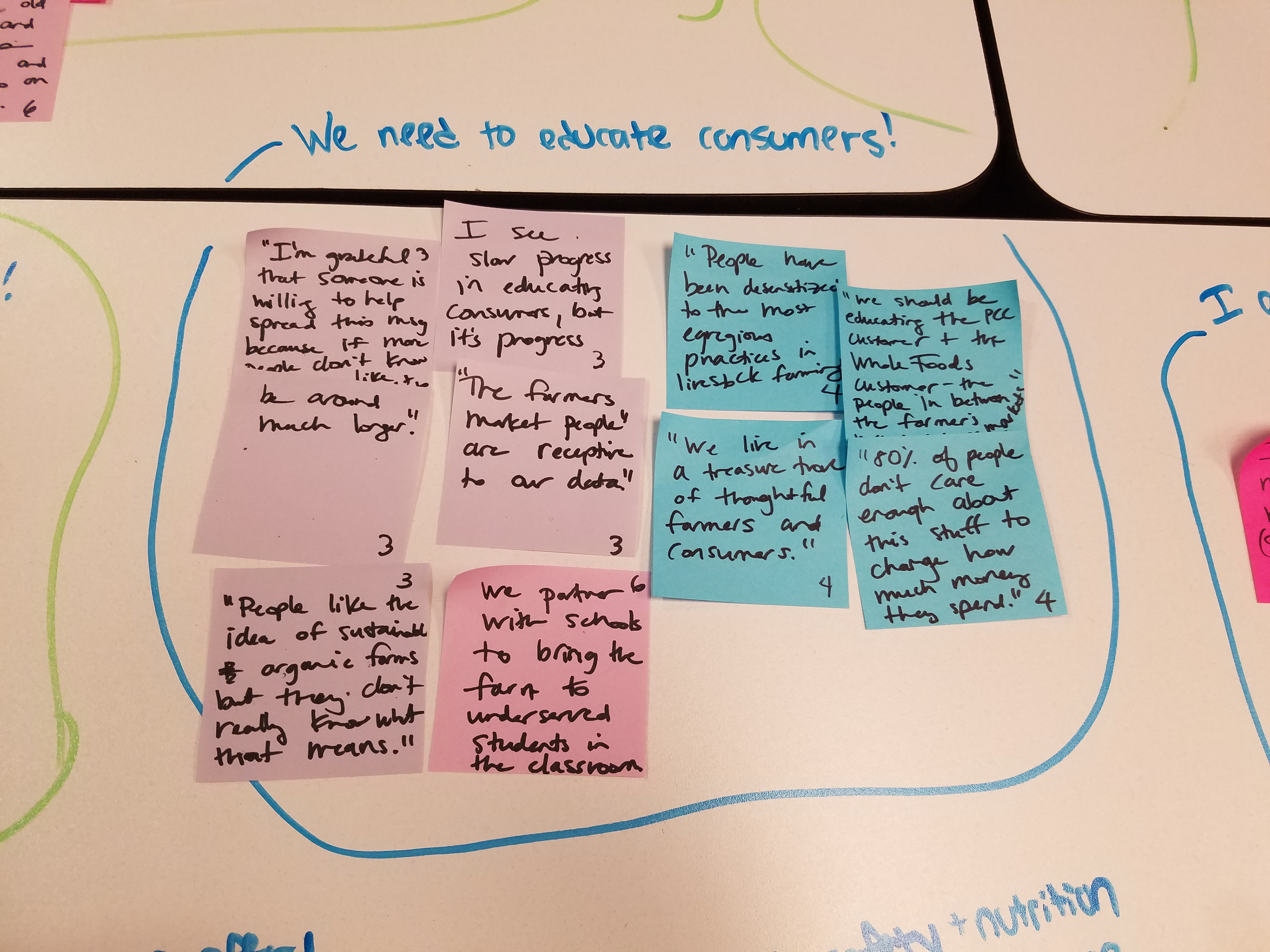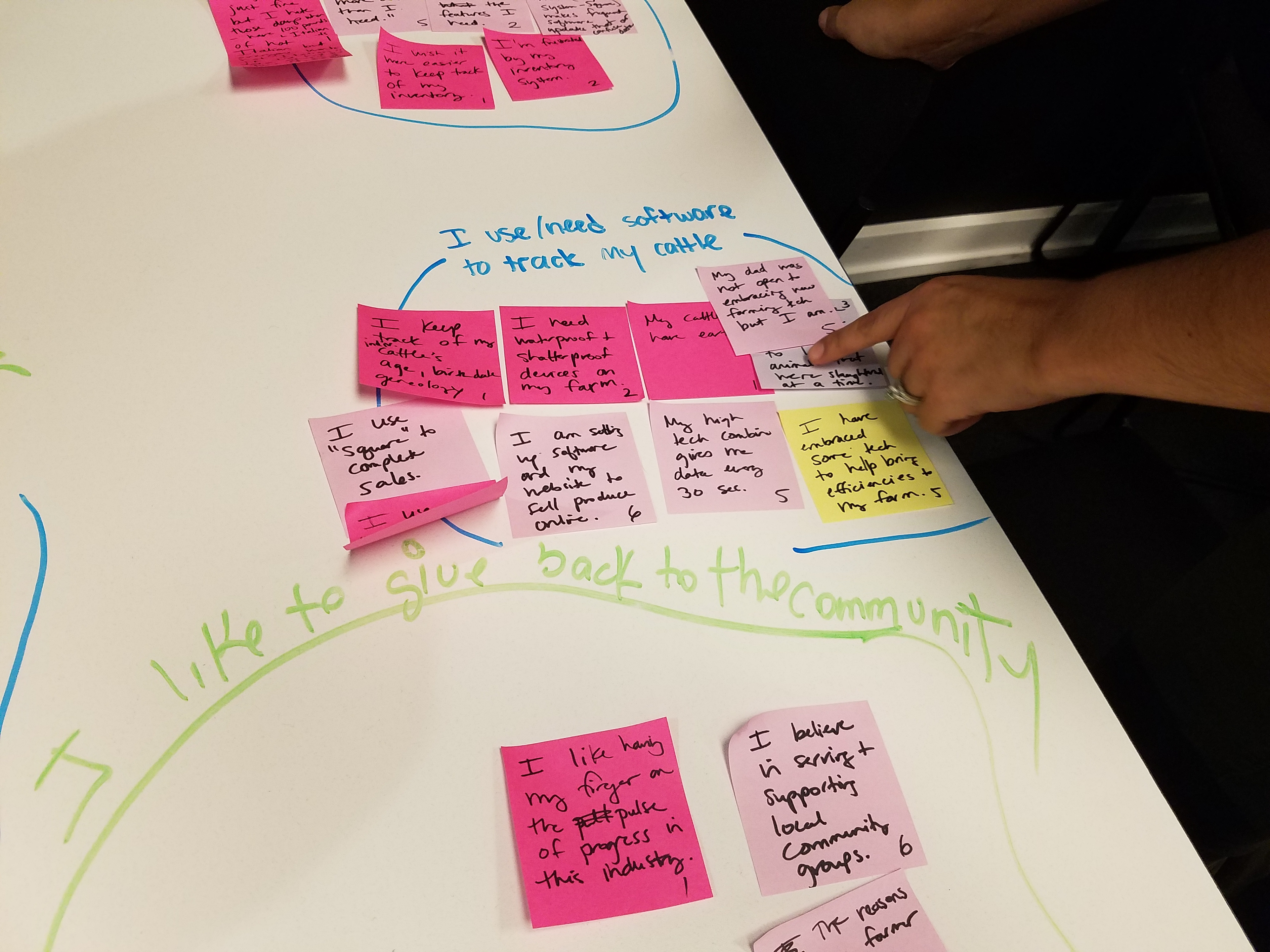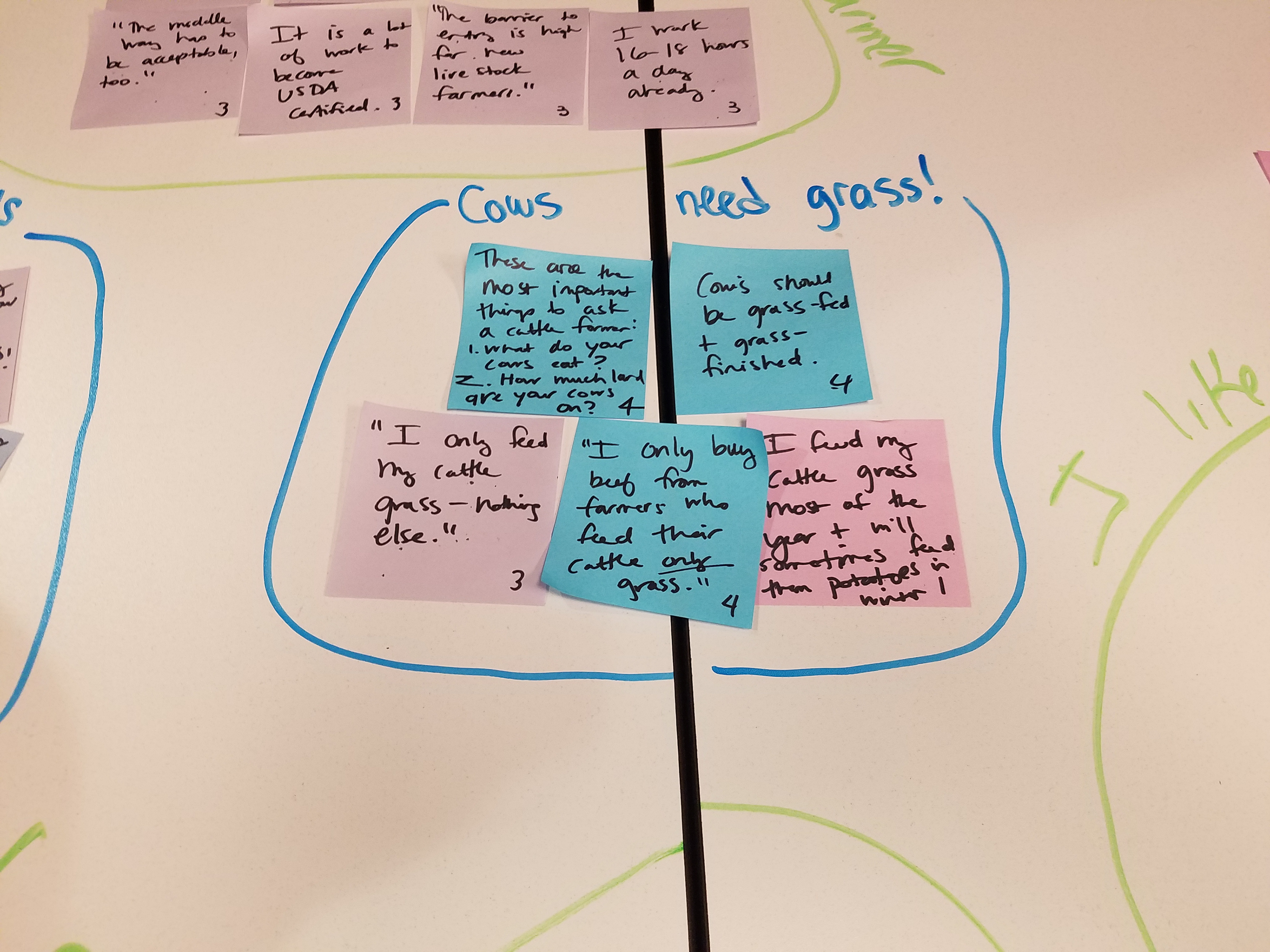 I suspect your very experienced team is already familiar with the process of affinity mapping to analyze user research. We used affinity mapping to find common threads, values and needs. The farmers who were willing to consider Transparent Path, the ProofScore product, and the idea of full transparency in the food supply chain are farmers who are already using sustainable farming practices. They make every effort to treat their cattle humanely and have strong views about how to make sure the beef they produce on their farm is nutrient rich.